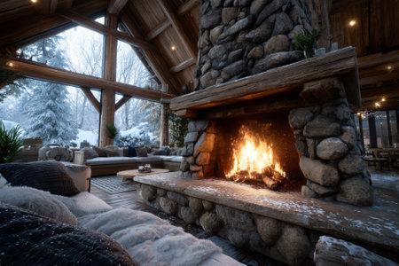 Inviting cozy cabin interior featuring a majestic stone fireplace radiating warmth and rustic charm