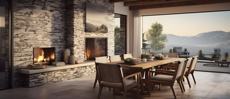 Luxury interior of a country house with fireplace and furniture.