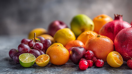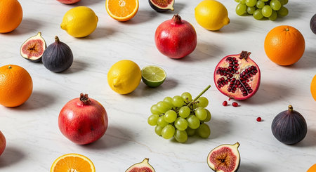 A vibrant assortment of fresh fruits including pomegranates, figs, oranges, lemons, and grapes on a marble...