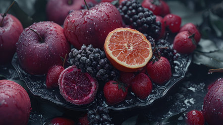 This image showcases a vibrant arrangement of fresh fruits on a dark background, highlighting their natural colors and textures. Perfect for discussions on healthy living and nutrition, this composition features a variety of fruits including apples, grapes, lemons, and oranges, making it ideal for food-related themes.