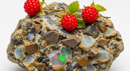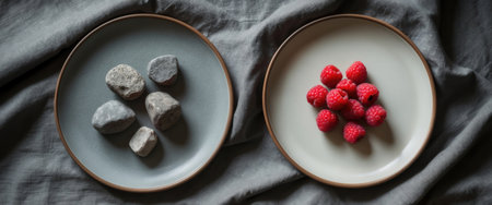 Two ceramic plates placed on a textured gray fabric. One plate holds smooth gray stones, while the other features vibrant red raspberries, emphasizing contrast in texture and color.