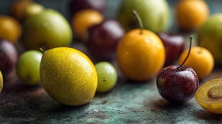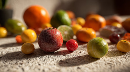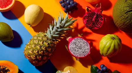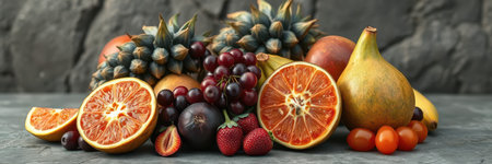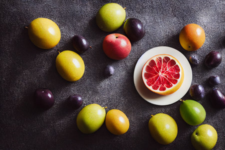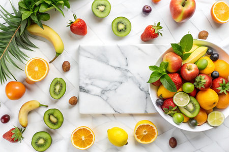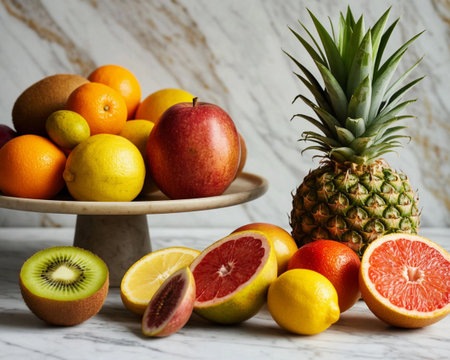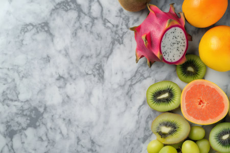Colorful fruit arrangement on marble, healthy food display