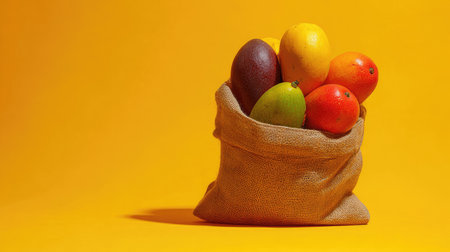 A collection of colorful fruit spills from a rustic burlap sack against a solid yellow backdrop. The arrangement includes mangoes, avocados and tomatoes in various shapes and hues. Overhead lighting creates distinct shadows, while the overall composition presents a vibrant and appealing visual, suitable for multiple commercial applications.