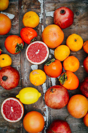 Fresh fruits. Mixed fruits background. Healthy eating, dieting. Background of healthy fresh fruits. Fruit salad - diet, healthy breakfast. pomegranate, persimmon, tangerine, banana, lemon