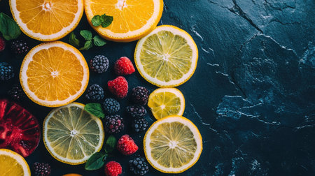 A vibrant display of fresh citrus slices, including lemons, limes, and oranges, alongside an assortment of berries set against a dark stone background.