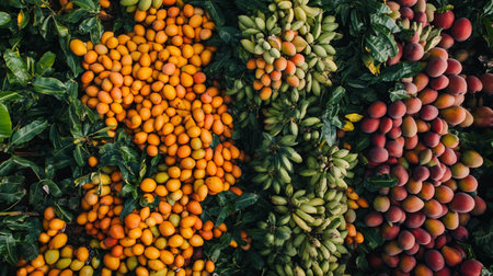 An abundant assortment of fresh, exotic fruits fills the scene, showing a vibrant blend of colors. The collection includes pineapples, grapes, oranges, and various berries, all intricately arranged against a lively backdrop of nature. This visually captivating display highlights the beauty of organic produce.