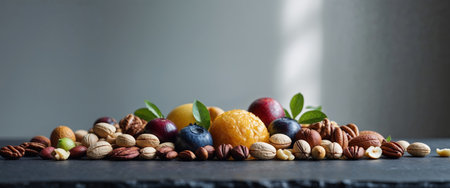 AI Generated. Assortment of nuts and fresh fruits on dark surface