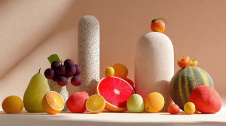 This captivating arrangement features a variety of colorful fruits alongside modern sculptures, creating a harmonious aesthetic suitable for interior decor or still life art.
