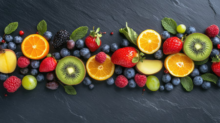 A vibrant mix of fresh fruits arranged on a slate background, offering a healthy and colorful visual appeal.