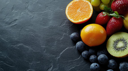 Slate background showcasing a mix of fresh fruits, creating a visually appealing and nutritious display.