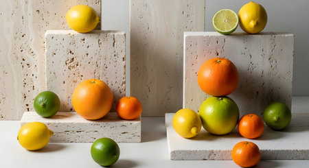 A modern minimalist still life composition featuring fresh citrus fruits like oranges, lemons, and limes arranged on beige travertine stone blocks. The geometric setup highlights the vibrant colors and natural freshness of the fruit against the textured stone.