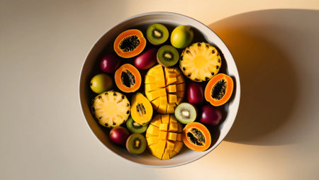 Top view of a bowl of colorful tropical fruits, arranged aesthetically with vibrant lighting