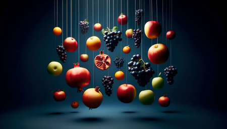 Fruits hanging from strings on dark background. Concept of healthy eating