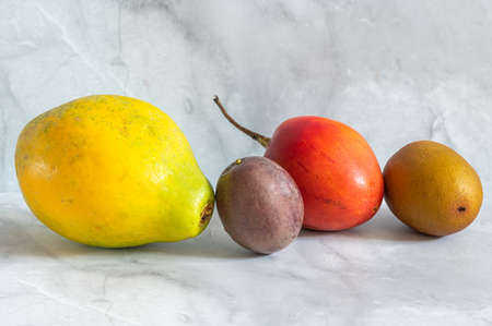 Juicy exotic fruits papaya, passion fruit, tamarillo and kiwi