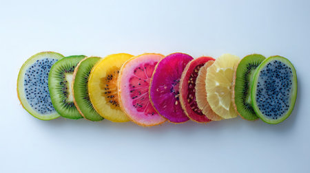 Colorful combination of sliced tropical fruits placed flat on a white surface