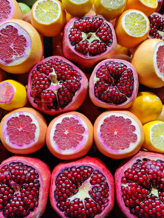 Many opened fruits at a market in Istanbul, Turkey during sunny day. Nice natural background with pomegranates, oranges and grape-fruits