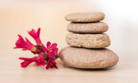 balancing zen pebble stones outdoor, spa wellness tranquil scene, soul equanimity concept, mental calmness, abstract retro colors