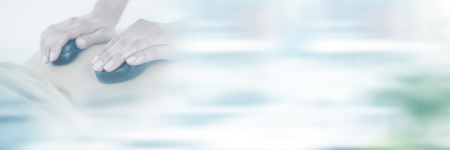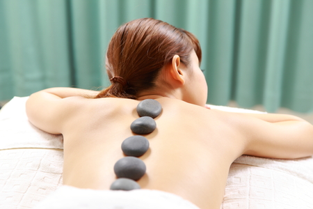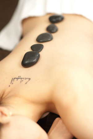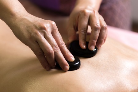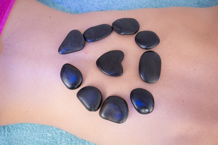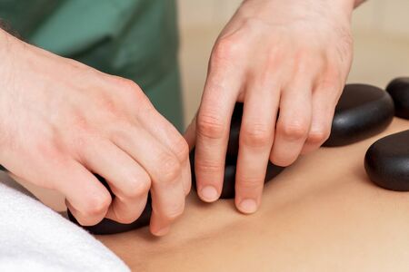 Hot spa volcanic lava stone placed on a female patients back, by a physiotherapist. Energy stones.