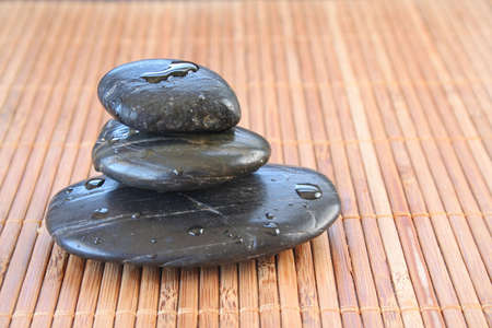 Three message stones stacked on one another with water drops all on a bamboo background.