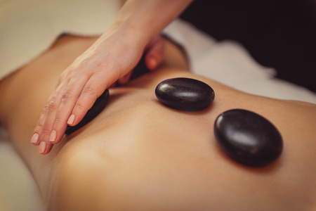Heated stones on back of woman. Stone massage therapy in spa for relaxing
