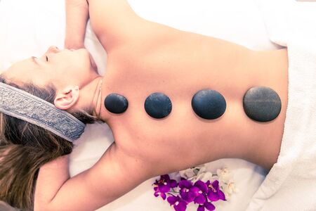 Spa hot stone thai massage beauty treatment.Young woman getting black hot stone on back her in spa salon
