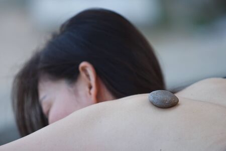 A beautiful Asian woman is relaxing in a spa shop when an expert masseuse places a hot stone on her back