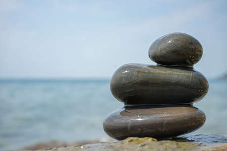 Balanced pebble pyramid on the beach on a sunny day. Abstract Sea bokeh on the background. Selective focus. Zen stones on the sea beach, meditation, spa, harmony, calmness, balance concept