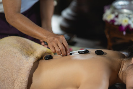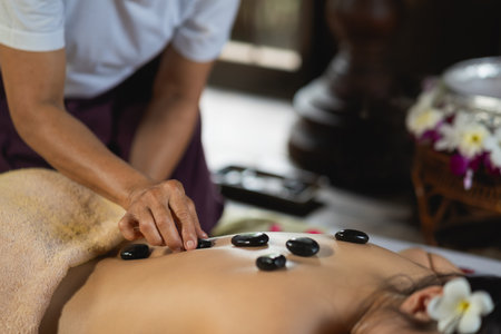 Woman receiving a hot stone therapy on her back, hands applying volcanic stones. Concept of spa treatment, relaxation, and therapeutic touch.