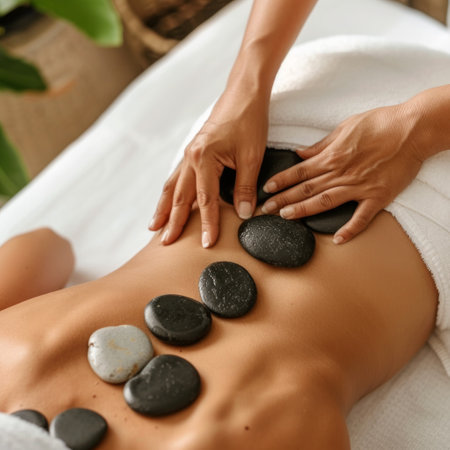 Relaxing Hot Stone Massage Session with Professional Therapist Applying Heated Stones on Client's Back in Serene Spa Environment