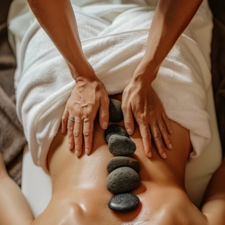 Hot stone massage therapy session, hands placing smooth stones on a woman's back. Spa treatment concept promoting relaxation and wellness.