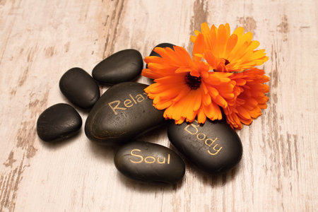 Black lava stones and marigold flower blooms on wooden boards with worn white color