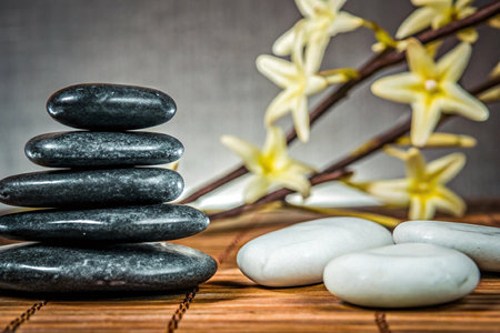 Close up of black Zen stones with Mind Body and Spirit text on the stones. Zen and peaceful concept.