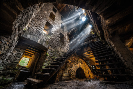 Dramatic view of an ancient stone stairway within a ruined building, with shafts of sunlight piercing the gloom. The stairway is weathered and old, revealing the texture of the stones. The interior is dimly lit, with the sunlight highlighting the details of the stone walls and the aged wood of the structure.
