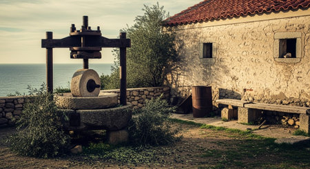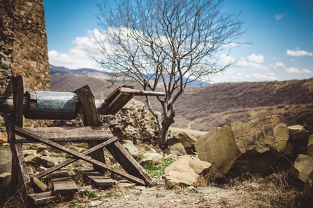 Rudimentary wood and stone machinery grinding wheel of a vintage windmill