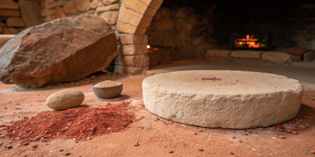 Granite grinding stone and tools are arranged in a rustic kitchen, surrounded by natural rock and earthy materials. Light filters in, highlighting their historical significance and functionality.