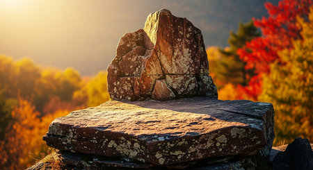 Autumn showing autumn mountain rock podium with golden sunlight and vibrant foliage background. resolution use.