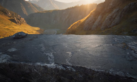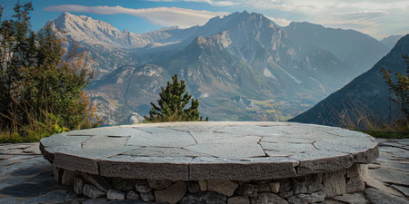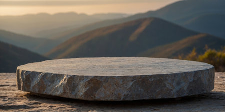 Product Presentation on Stone Pedestal Outdoors, Ideal for Highlighting Goods Against Nature Background with Mountains, Perfect for Advertisement and Commercial Display