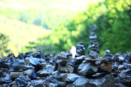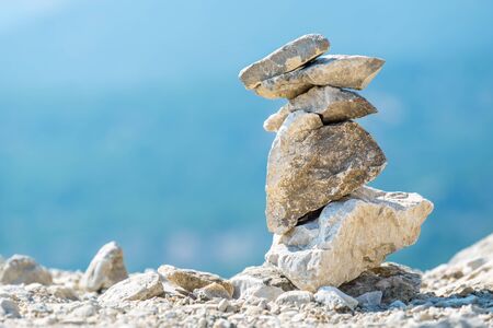 Close up of a stone cairn in the mountains. Beautiful natural background