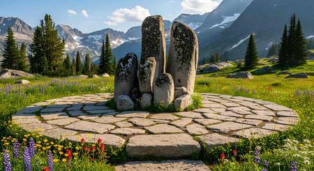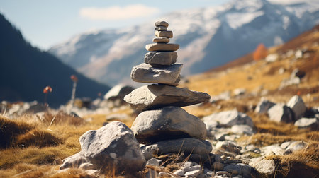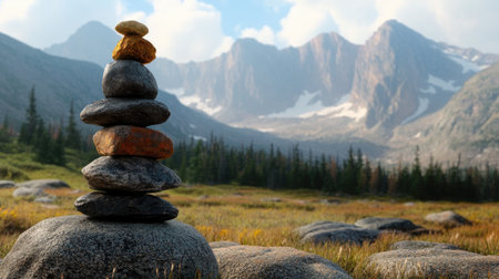 A serene stone cairn stands majestically in a lush meadow, surrounded by breathtaking mountains under a clear blue sky, symbolizing balance and peace.