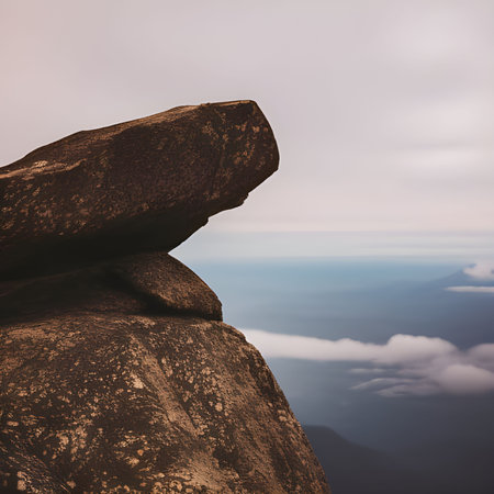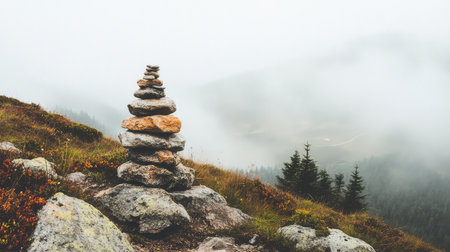 A serene scene featuring a carefully stacked arrangement of stones in a misty mountain landscape, evoking feelings of balance and tranquility.