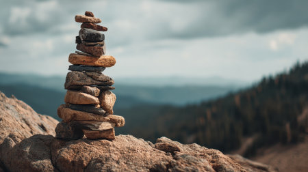 A serene arrangement of stacked stones atop rugged terrain against a dramatic sky. This image captures the essence of balance and tranquility in nature