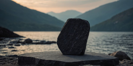 AI Generated. Stage for product display presentation with black rock pedestal Minimalistic natural showcase