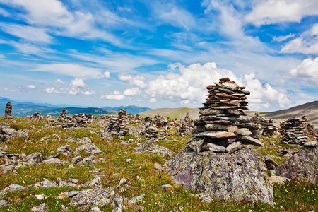Stone pyramids on the mountain pass. Altai mountains, Siberia, Russia