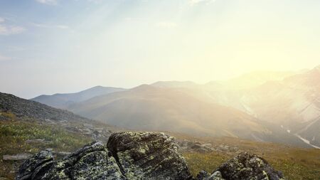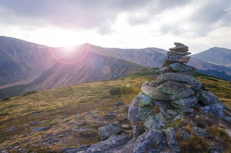 Stone cairn on the mountain top. Vacation and isolation in the wild. Amazing landscape in the mountains with lens flare