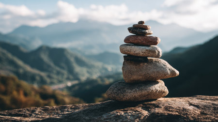 Serene zen meditation landscape with balanced stones in a tranquil natural environment