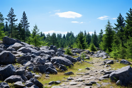 Immersing in Nature's Beauty: a Serene Summer Landscape of Igneous Rock Stones, Evergreen Coniferous Forest, and a Vast Blue Sky