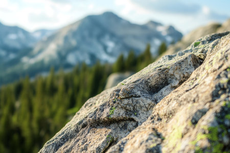 Close-up of textured cliff stone with panoramic mountain views in the background and soft sunlight casting shadows
