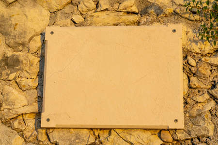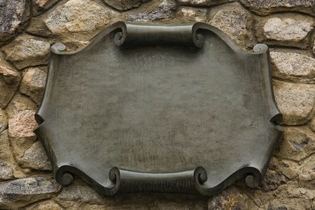 foreground of a empty plaque on a wall of stone