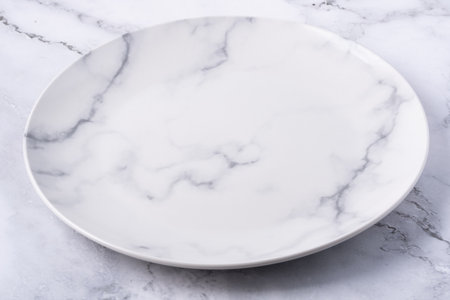 Round white plate with marble design on a light surface for serving food