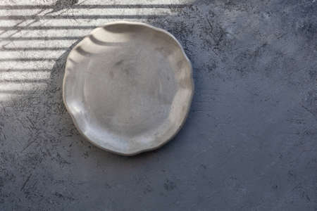 Empty round ceramic plate as an item of kitchen utensils on a textured concrete background